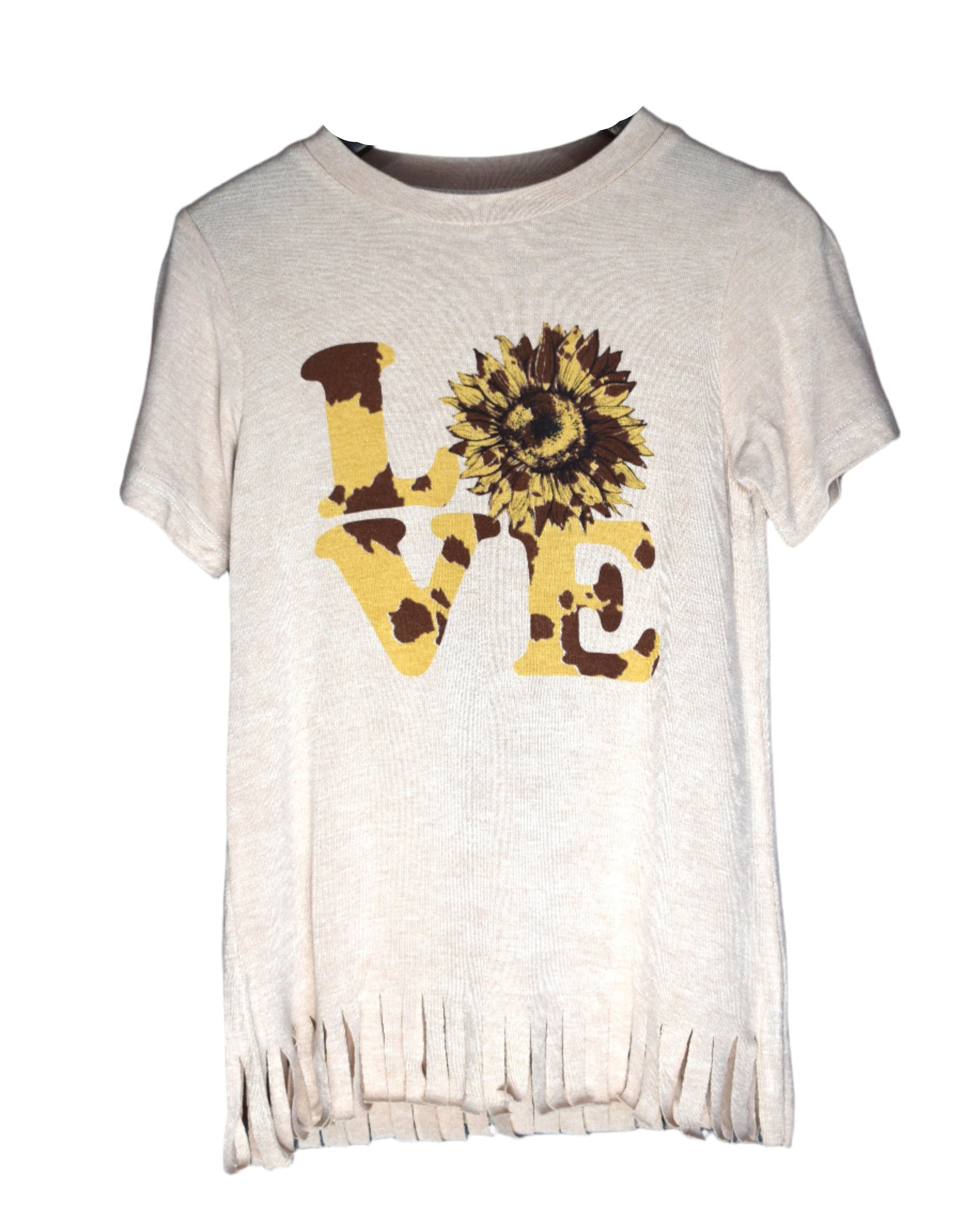 A must-have "LOVE" sunflower short sleeve t-shirt. Made from high-quality materials, this t-shirt is both stylish and comfortable. Show off your love for nature and fashion with this unique design. Perfect for any occasion, this t-shirt is a must-have for any fashion-forward individual.