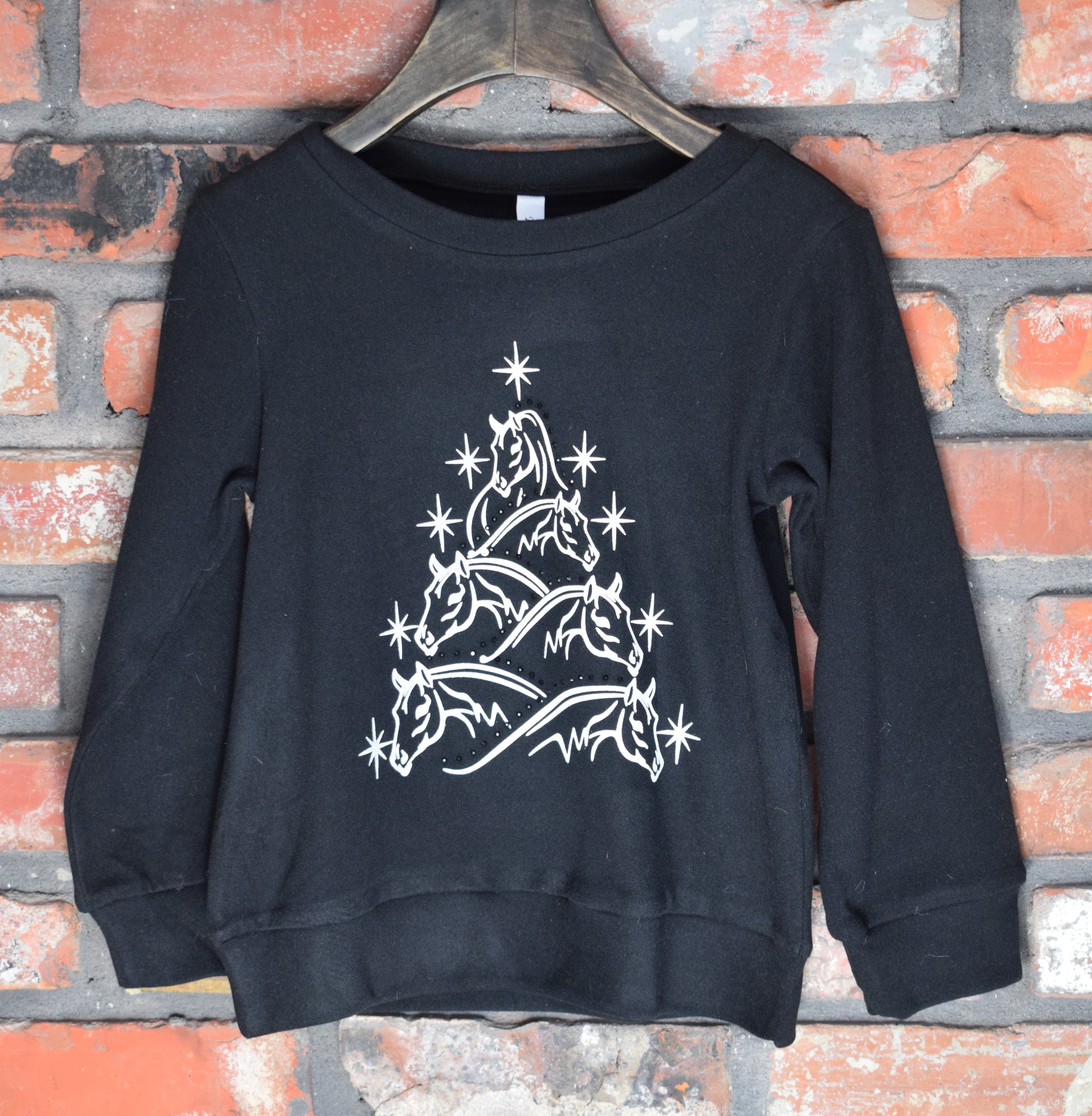 This sweatshirt features a festive Christmas tree design with silhouette horses. Made with soft and breathable fabric, this sweatshirt combines holiday cheer with comfort for the perfect winter wardrobe addition. Perfect for horse lovers and holiday enthusiasts alike.