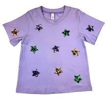 Let your little one sparkle like the star they are in our MT013 Mardi Gras Star Tee! This festive t-shirt features colorful sequin star appliqués in classic Mardi Gras colors — purple, green, and gold — scattered playfully across the front and sleeves. Available in soft lavender and crisp white, this top adds shimmer and charm to any Mardi Gras celebration.