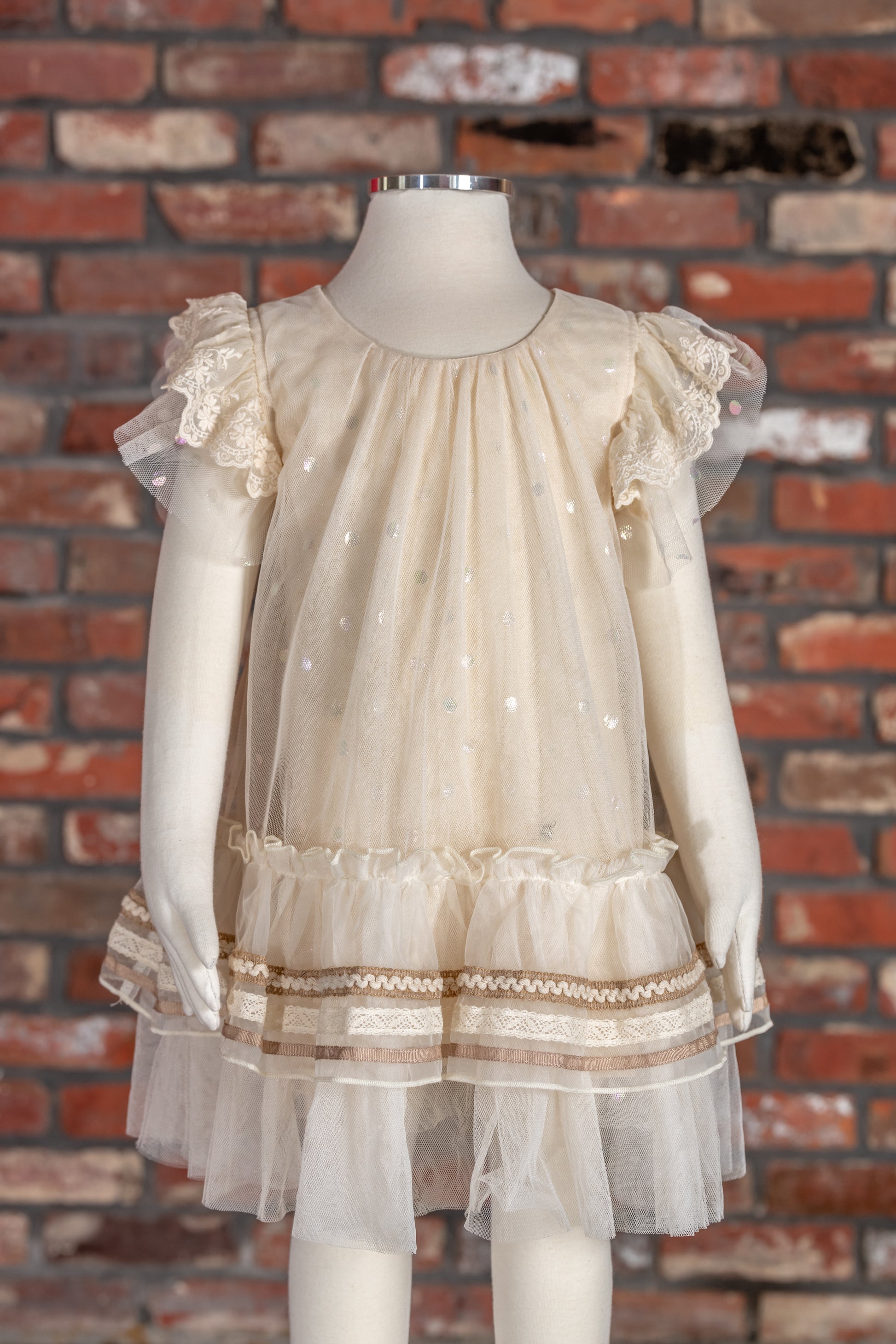 This is the perfect ivory dress for special occasions. This stunning piece features elegant ruffled sleeves and a charming gold trim for added flair. Your little one will look absolutely charming and stand out in the crowd. (A must-have for fancy events!)