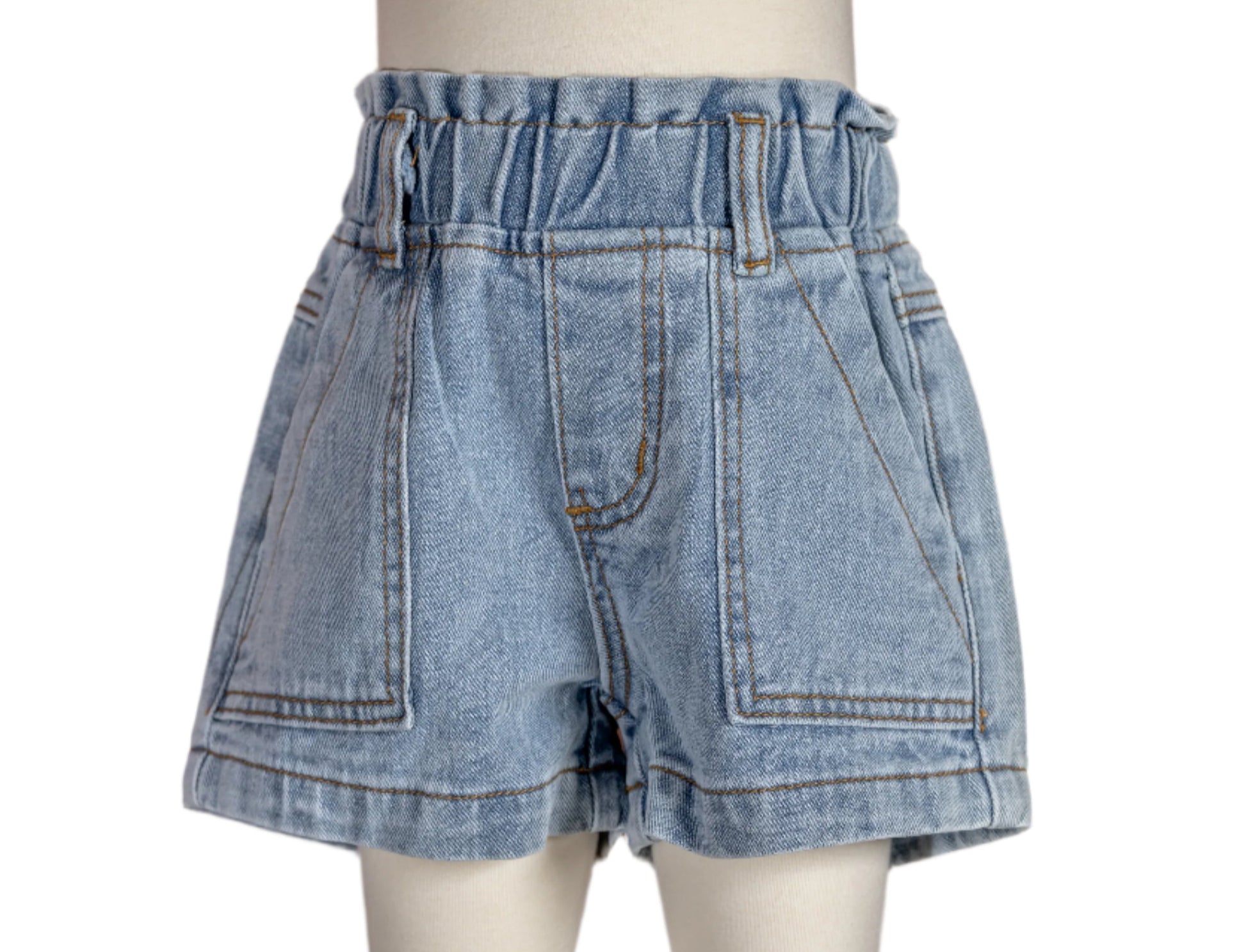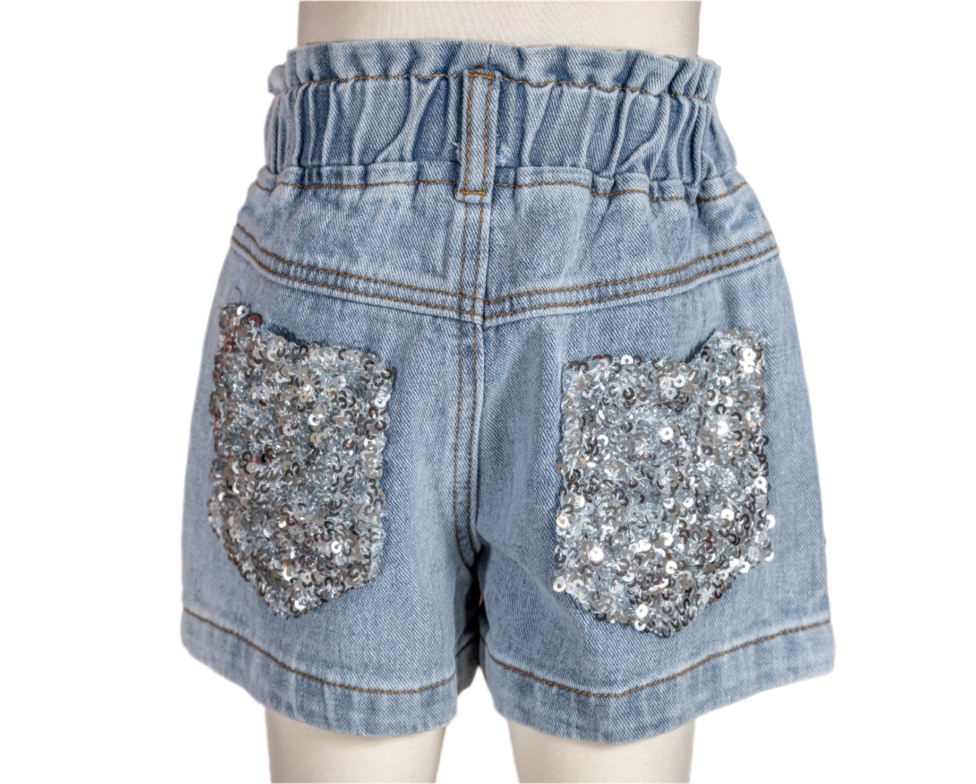 These denim shorts features a stylish waistband and functional pockets, these shorts are not only fashionable but also practical. The back pockets are even detailed with sequins, adding a fun touch. Made from durable denim material, these shorts will be a staple in your child's closet.