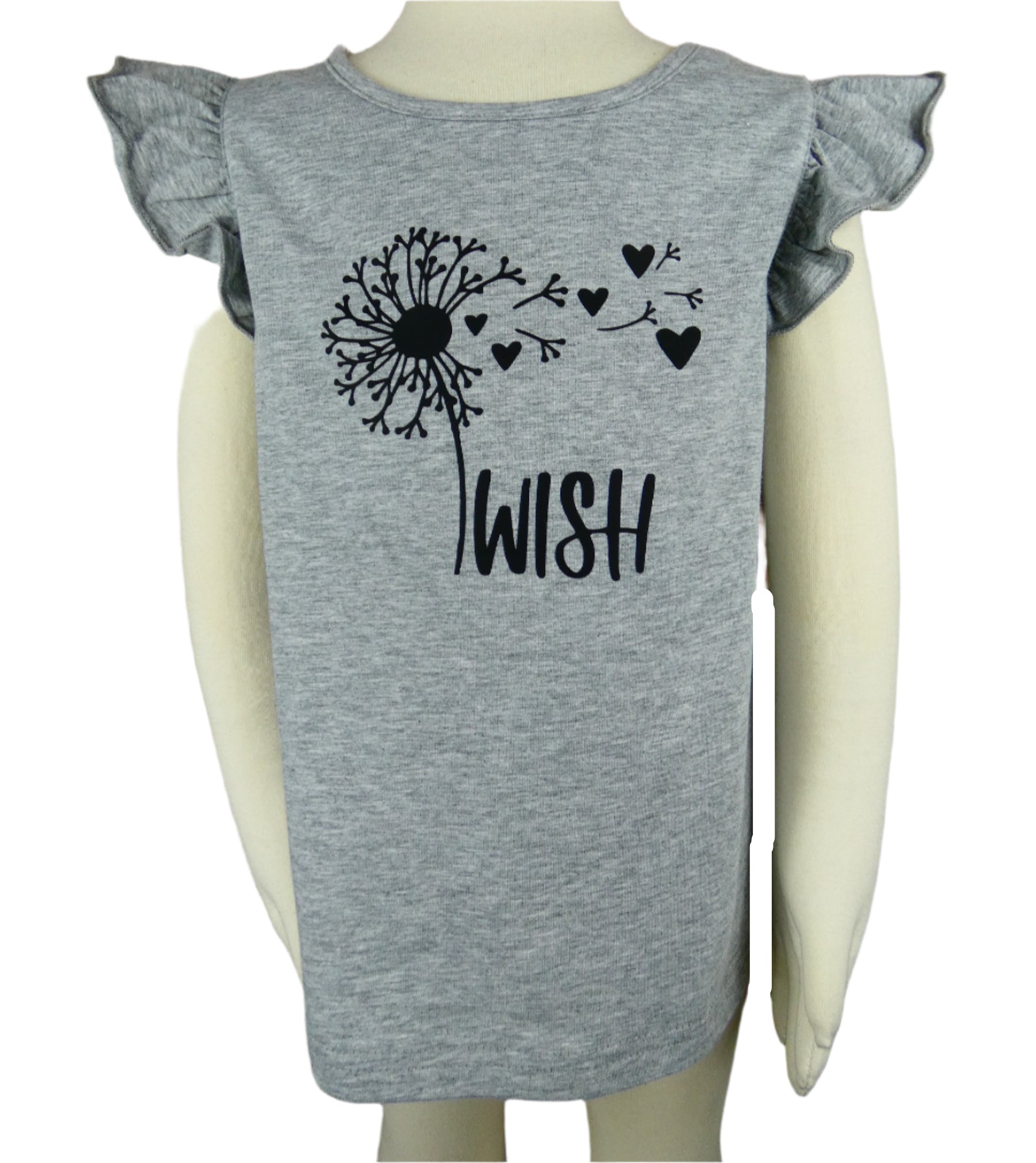 Our ST0115 T-shirt for kids is a must-have for any little one's wardrobe. The charming dandelion design with the word "wish" and ruffle cap sleeves adds a touch of whimsy to any outfit. Made with high-quality materials, this T-shirt offers both comfort and style, making it perfect for all-day wear.