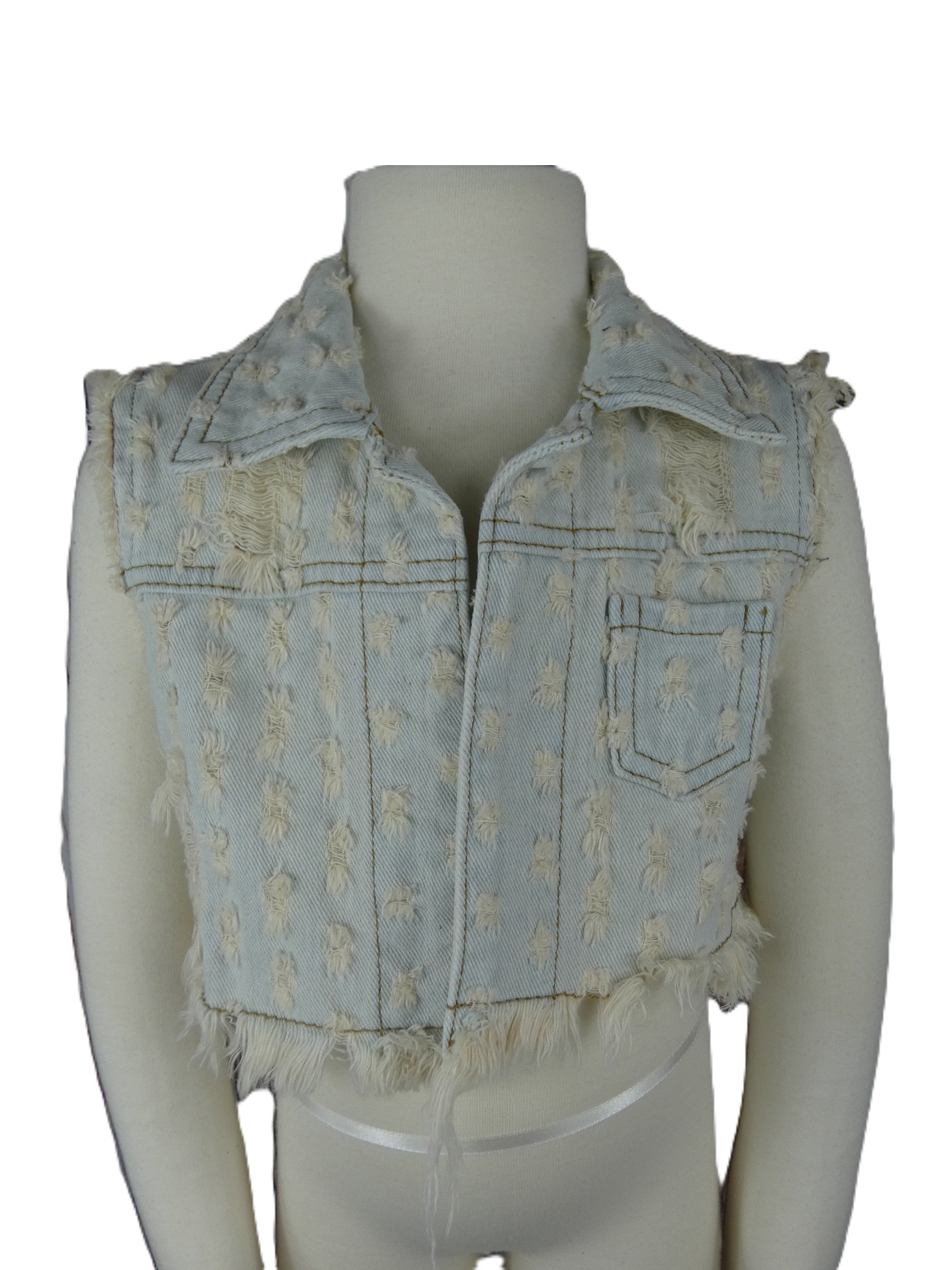 Add a touch of edgy style to your child's wardrobe with SV0023, a cropped denim vest featuring a playful destructed design. Perfect for layering over a white shirt, this trendy piece is sure to elevate any outfit with its stylish and fun look.